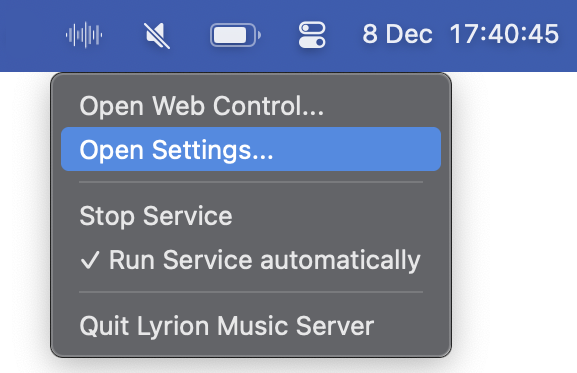 After installation you will have a new app in your Mac's Applications folder called "Lyrion Music Server". When you run this, it will insert a menu into your menu bar right-hand side, from which you can start/stop the server. Note that launching the app does not automatically start the server. On this first running you may find various security requests from your Mac system