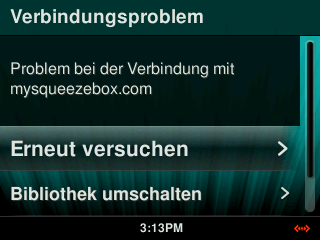 Falls Sie die Mitteilung "Verbindungsproblem - Problem bei der Verbindung mit MySqueezebox.com" erhalten, dann können nach "Bibliothek umschalten" runter scrollen und sich mit ihrem LMS verbinden.